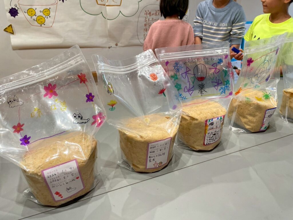 いよいよ、自分たちの手でお味噌づくり。茹でた大豆は、やわらかくて、いい香り。そのままでもおいしそうです。袋の上から手でつぶしたり、足で踏んだり。「思ったより力がいる!」「まだ粒が残ってる!」見た目以上に、なかなかの重労働。みんな真剣な表情で取り組みます。塩切麹を混ぜたら、空気を抜いて、ぎゅっと丸めていきます。お団子づくりは、さすがみんなお手のもの。