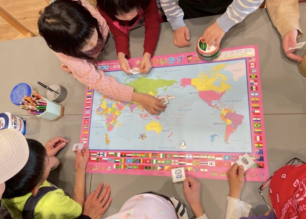 前半は、世界中の発酵食品を集めた探究タイム。テーブルに並んだ発酵食品を手に取りながら 「これは、どこの国で食べられているんだろう?」と、地図を広げて調べ学習が始まりました。「パッケージのこの文字、韓国語だ!」「裏を見たらドイツって書いてあるよ」「ブルガリアってどこかな?」チーズにヨーグルト、キムチ、ザワークラウト、アンチョビ……。日本だけでなく、世界中で発酵食品が作られていることに、子どもたちは驚いた様子です。